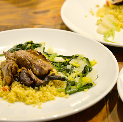 Slow cooked NZ leg of lamb marinated with a mix of honey, fresh thyme, ginger, garlic, lemon zest and butter.Served with honey mustard couscous, curry leaf potatoes and wilted greens.